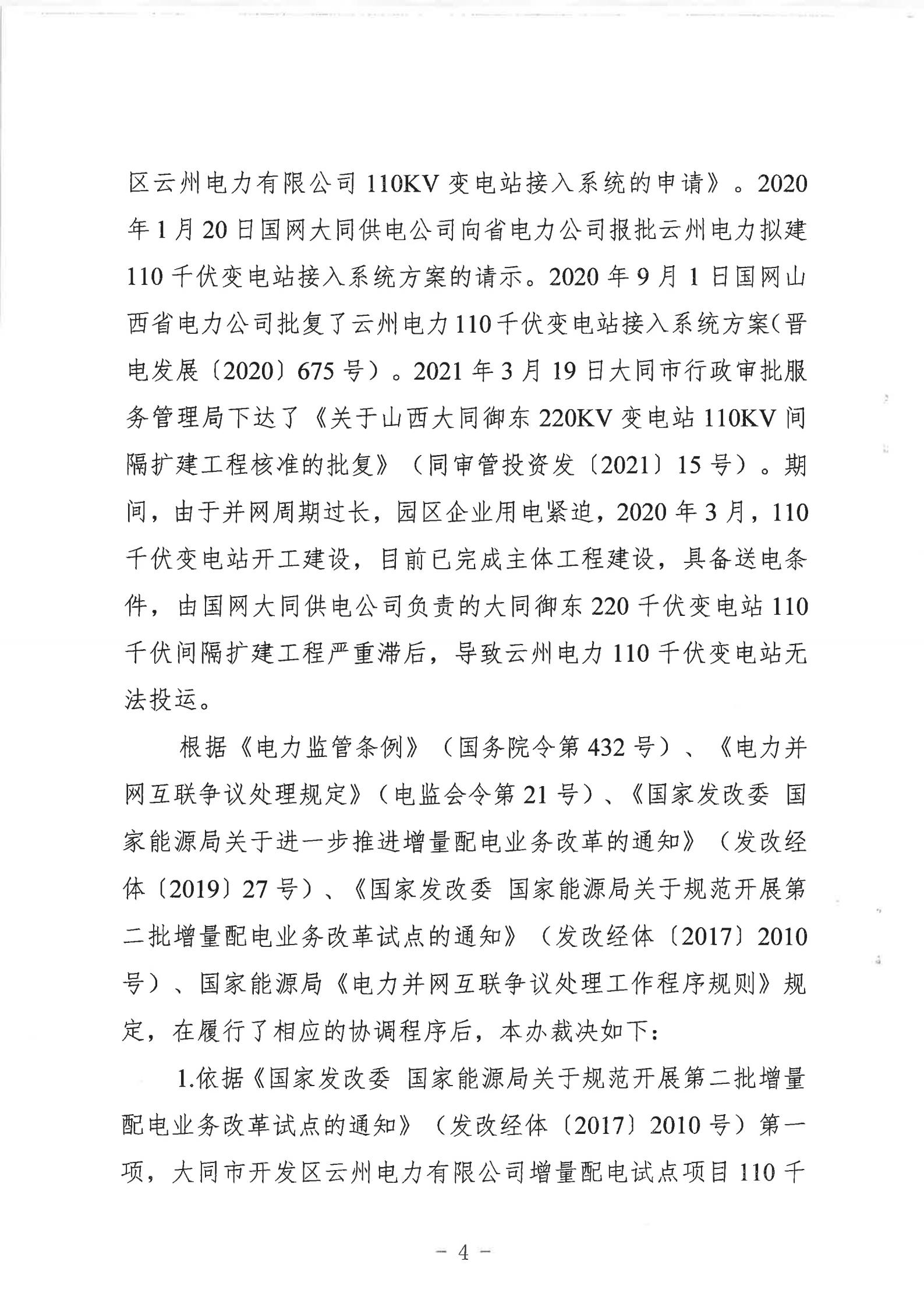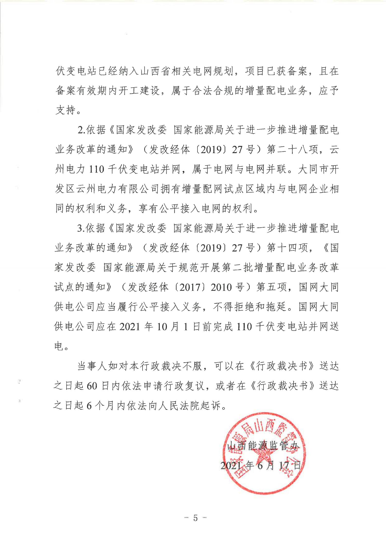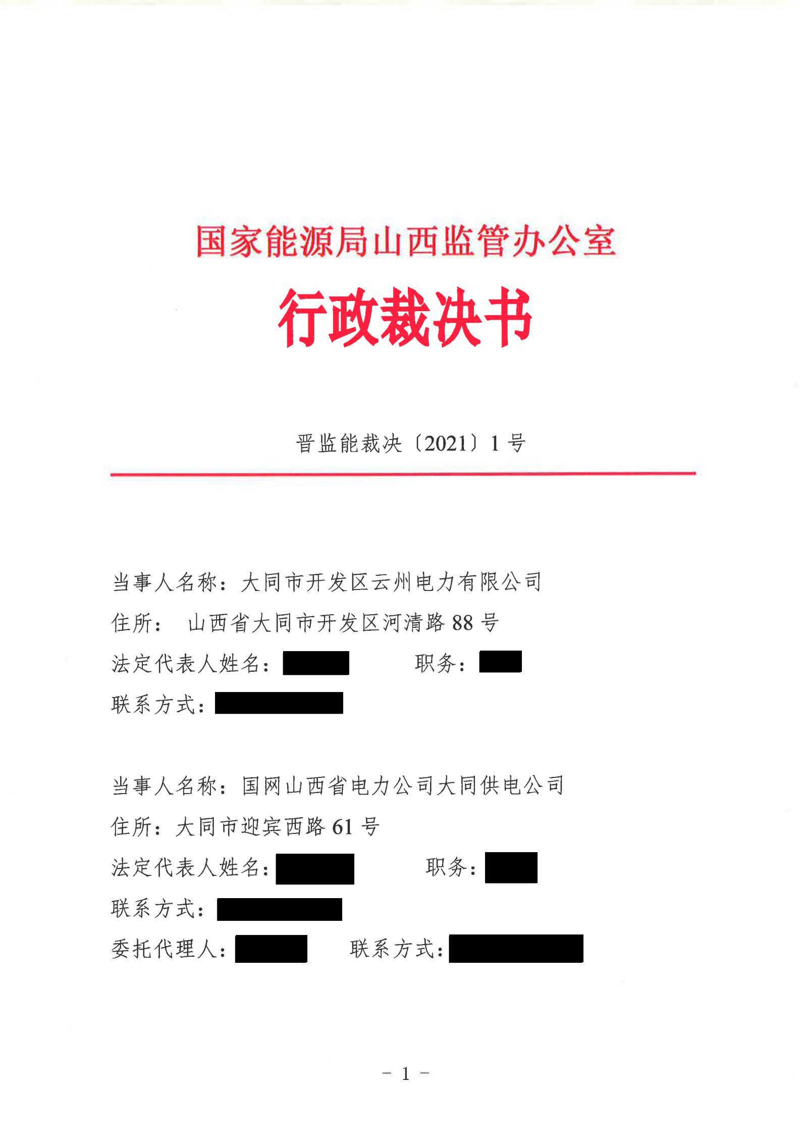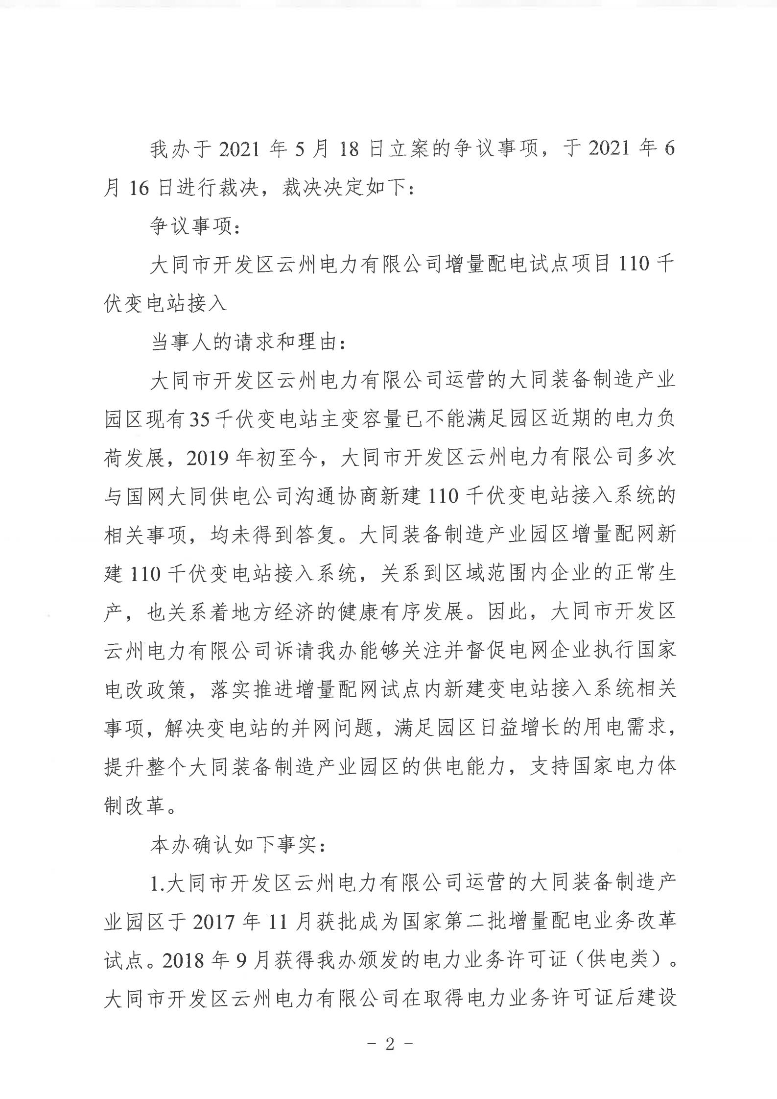 山西能監(jiān)辦近日發(fā)布行政裁決書(晉監(jiān)能裁決【2021】1號(hào)),裁決書顯示,山西能監(jiān)辦于2021年5月18日立案爭(zhēng)議事項(xiàng),于2021年6月16日進(jìn)行裁決。爭(zhēng)議事項(xiàng)為大同市開發(fā)區(qū)云州電力有限公增量配電試點(diǎn)項(xiàng)目110千伏變電站接入。 當(dāng)事人的請(qǐng)求和理由:大同市開發(fā)區(qū)云州電力有限公司運(yùn)營(yíng)的大同裝備制造產(chǎn)業(yè)園區(qū)現(xiàn)有35千伏變電站主變?nèi)萘恳巡荒軡M足園區(qū)近期的電力負(fù)荷發(fā)展,2019年初至今,大同市開發(fā)區(qū)云州電力有限公司多次與國(guó)網(wǎng)大同供電公司溝通協(xié)商新建110千伏變電站接入系統(tǒng)的相關(guān)事項(xiàng),均未得到答復(fù)。大同市開發(fā)區(qū)云州電力有限公司訴請(qǐng)山西能監(jiān)辦能夠關(guān)注并督促電網(wǎng)企業(yè)執(zhí)行國(guó)家電改政策,落實(shí)推進(jìn)增量配網(wǎng)試點(diǎn)內(nèi)新建變電站接入系統(tǒng)相關(guān)事項(xiàng),解決變電站的并網(wǎng)問題,滿足園區(qū)日益增長(zhǎng)的用電需求,提升整個(gè)大同裝備制造產(chǎn)業(yè)園區(qū)的供電能力。 山西能監(jiān)辦裁決: 大同市開發(fā)區(qū)云州電力有限公司增量配電試點(diǎn)項(xiàng)目110千伏變電站已經(jīng)納入山西省相關(guān)電網(wǎng)規(guī)劃,項(xiàng)目已獲備案,且在備案有效期內(nèi)開工建設(shè),屬于合法合規(guī)的增量配電業(yè)務(wù),應(yīng)予支持。 大同市開發(fā)區(qū)云州電力有限公司擁有增量配網(wǎng)試點(diǎn)區(qū)域內(nèi)與電網(wǎng)企業(yè)相同的權(quán)利與義務(wù),享有公平接入電網(wǎng)的權(quán)利。 國(guó)網(wǎng)大同供電公司應(yīng)當(dāng)履行公平接入義務(wù),不得拒絕和拖延。國(guó)網(wǎng)大同供電公司應(yīng)在2021年10月1日前完成110千伏變電站并網(wǎng)送電。 以下為原文: