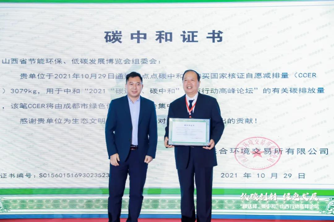 祥睿能源作為會(huì)議協(xié)辦單位,結(jié)合會(huì)議“低碳創(chuàng)新·綠色發(fā)展”的主題,聯(lián)合主辦方打造成了名副其實(shí)的山西首次碳中和博覽會(huì),即將本次會(huì)議執(zhí)行過(guò)程中產(chǎn)生的二氧化碳排放量,通過(guò)購(gòu)買(mǎi) CCER實(shí)現(xiàn)了碳減排的抵消。同時(shí),在現(xiàn)場(chǎng)授予了大會(huì)組委會(huì)《碳中和證書(shū)》,由省節(jié)能協(xié)會(huì)會(huì)長(zhǎng)藺建國(guó)代表組委會(huì)領(lǐng)取了該項(xiàng)證書(shū)。