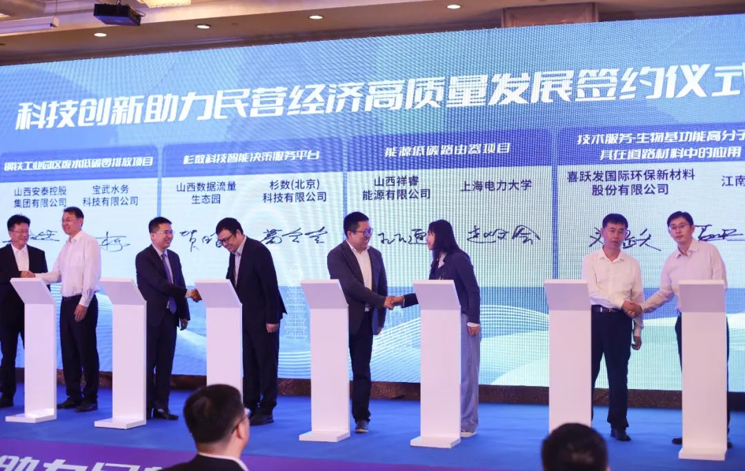 山西祥睿能源有限公司、山西安泰控股集團有限公司、山西晉城鋼鐵控股集團有限公司、山西數(shù)據(jù)流量生態(tài)園等11家山西民營企業(yè)與寶武水務科技有限公司、中冶京誠工程技術有限公司、杉數(shù)(北京)科技有限公司等11家企業(yè)、高等院校、科研院所進行了科技成果轉化運用簽約。 活動期間還舉辦了“合作共建數(shù)字綠色產(chǎn)業(yè)體系 助力山西民營經(jīng)濟高質量發(fā)展”分論壇和異地晉商會長聯(lián)席會暨晉滬兩地青年企業(yè)家交流研討會。 |