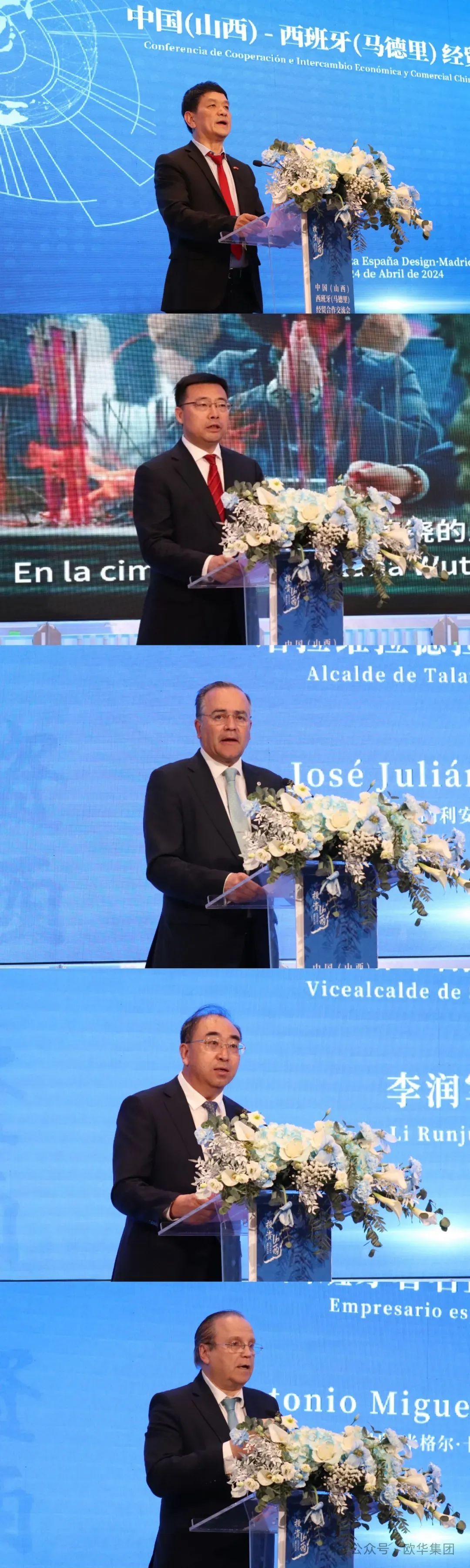 西班牙中華總商會(huì)會(huì)長(zhǎng)陳蘇忠,山西省工商聯(lián)常務(wù)副主席陳旭忠,塔拉維拉德拉雷納市市長(zhǎng)何塞·胡利安·格雷戈里奧,朔州市副市長(zhǎng)李潤(rùn)軍,以及西班牙著名企業(yè)家安東尼奧·米格爾·卡爾莫納分別發(fā)言。