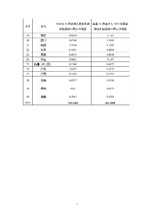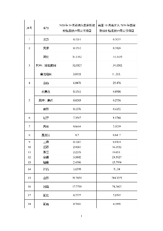 按照《國家能源局關(guān)于2020年風(fēng)電、光伏發(fā)電項(xiàng)目建設(shè)有關(guān)事項(xiàng)的通知》(國能發(fā)新能〔2020〕17號(hào),以下簡稱《通知》)和《國家能源局綜合司關(guān)于2019年戶用光伏項(xiàng)目信息公布和報(bào)送有關(guān)事項(xiàng)的通知》(國能綜通新能〔2019〕45號(hào))關(guān)于戶用光伏項(xiàng)目管理有關(guān)要求,全國共有30個(gè)省份報(bào)送了戶用光伏項(xiàng)目信息(西藏?zé)o納入2020年財(cái)政補(bǔ)貼規(guī)模戶用光伏項(xiàng)目,未報(bào)送)。 根據(jù)各省級(jí)能源主管部門、電網(wǎng)企業(yè)報(bào)送信息,經(jīng)國家可再生能源信息管理中心梳理統(tǒng)計(jì),2020年10月新納入國家財(cái)政補(bǔ)貼規(guī)模戶用光伏項(xiàng)目總裝機(jī)容量為133.44萬千瓦,詳細(xì)情況見附表。截至10月底,全國累計(jì)納入2020年國家財(cái)政補(bǔ)貼規(guī)模戶用光伏項(xiàng)目裝機(jī)容量為661.44萬千瓦,已超過2020年度可安排的600萬千瓦新增項(xiàng)目年度裝機(jī)總量。 按《通知》中“當(dāng)截至上月底的當(dāng)年累計(jì)新增并網(wǎng)裝機(jī)容量超過當(dāng)年可安排的新增項(xiàng)目年度裝機(jī)總量時(shí),發(fā)布戶用戶用光伏信息時(shí)的當(dāng)月最后一天為本年度可享受國家補(bǔ)貼政策的戶用光伏并網(wǎng)截止時(shí)間”的規(guī)定,為保障行業(yè)平穩(wěn)健康發(fā)展,2020年11月30日為納入2020年國家財(cái)政補(bǔ)貼規(guī)模戶用光伏項(xiàng)目并網(wǎng)截止日期。 附表 納入2020年國家財(cái)政補(bǔ)貼規(guī)模戶用光伏項(xiàng)目 裝機(jī)容量統(tǒng)計(jì)表 (截至2020年10月31日) 單位:萬千瓦